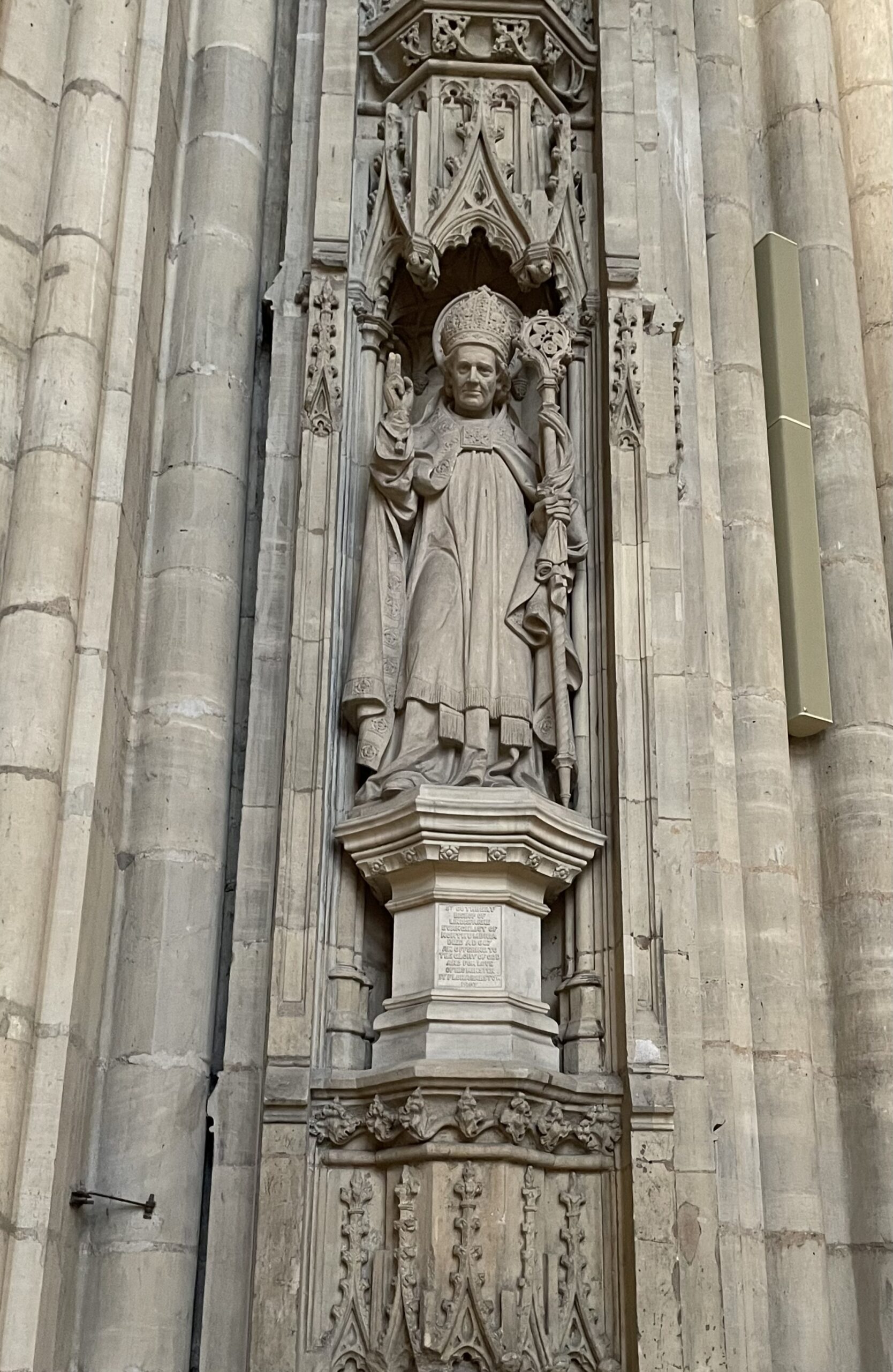 Until the restoration of the Cuthbert window is completed, you can find other traces of Cuthbert in the Minster.  The Chapel of Saint Cuthbert is at the South West end of the Nave and there’s a lovely little statue of him on the South West pillar of the crossing.
